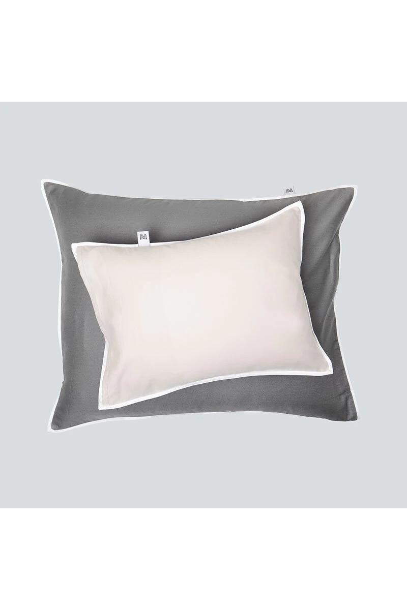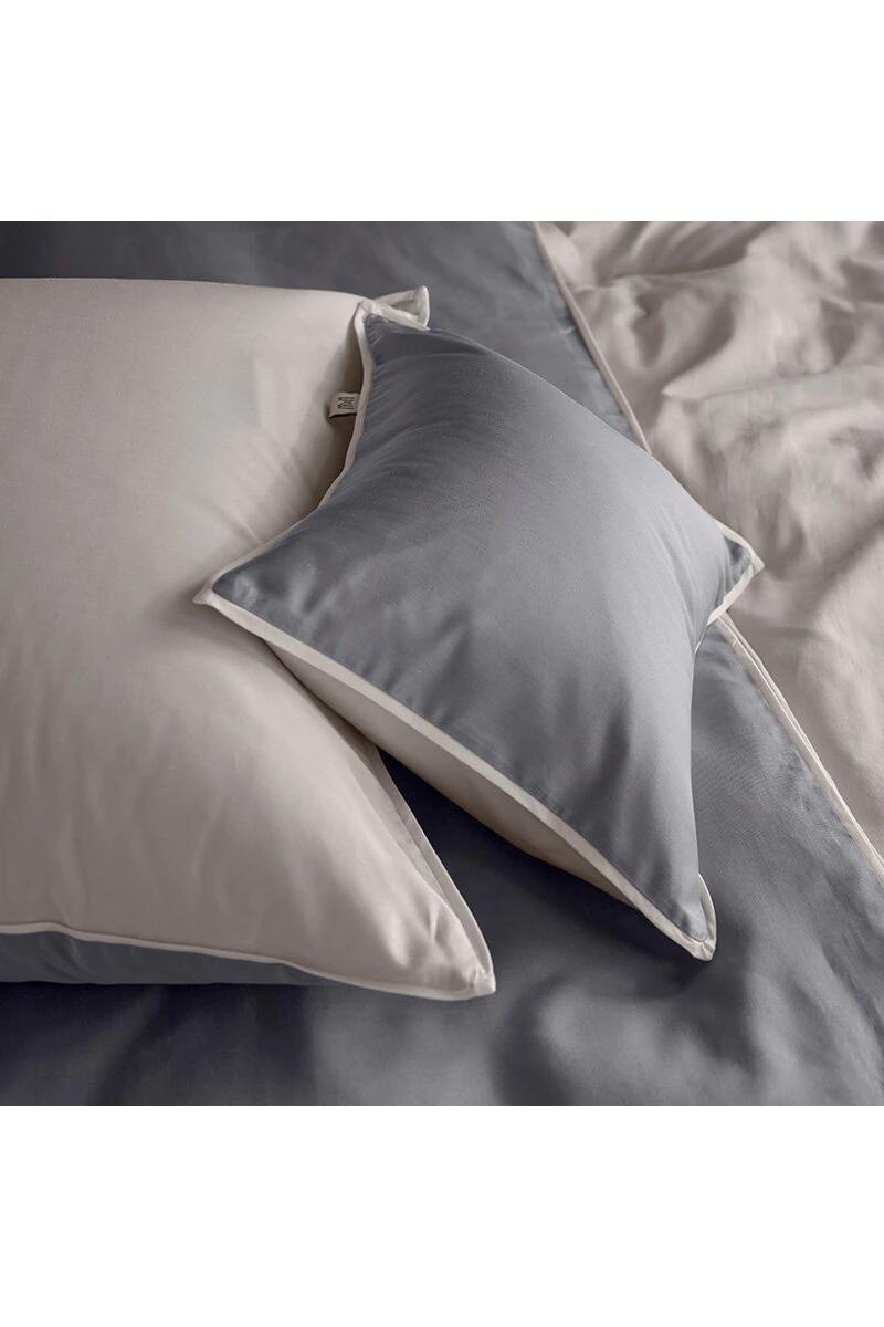 Putetrekk i luksuriøs myk og deilig sateng produsert av finkjemmet bomull. Trådtetthet: 340 tc. Stilrent design med forskjellige farger foran og på baksiden som rammes inn av en 3 mm piping. Lukking med overlapping på baksiden.